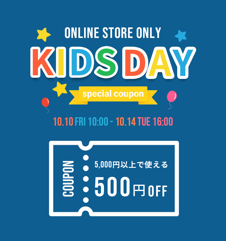 会員様へすぐに使える、キッズ商品1点以上を含む、5,000円(税込)以上のお買い上げで使える500円OFFFクーポンプレゼントしています。