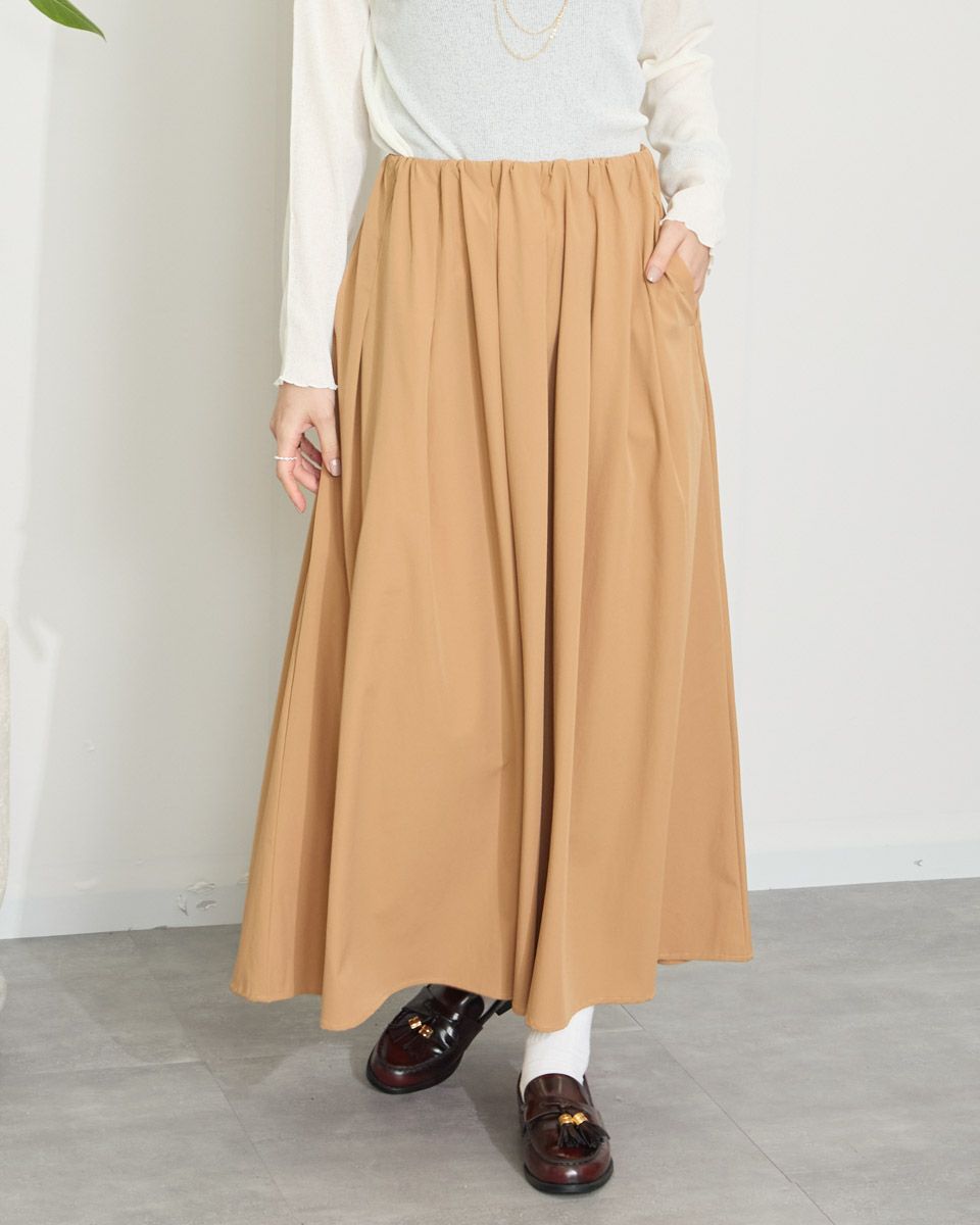 かるくてシワになりにくい生地です たっぷりのフレアでエレガントです ウエストが総ゴムなのでとても楽で穿きやすいです -