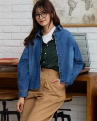 アイボリーMを購入、モデルさんの着ているデニムAラインスカートにインして着てみました。思ったより活用できそうです。 -