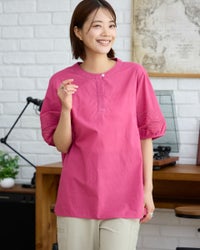 ローズピンクを購入。 色は写真より落ちついてます。 ゆったりして、袖がかわいいのですが、首まわりが思いのほかきついです。 私はボタンをしめたまま着れません。 -