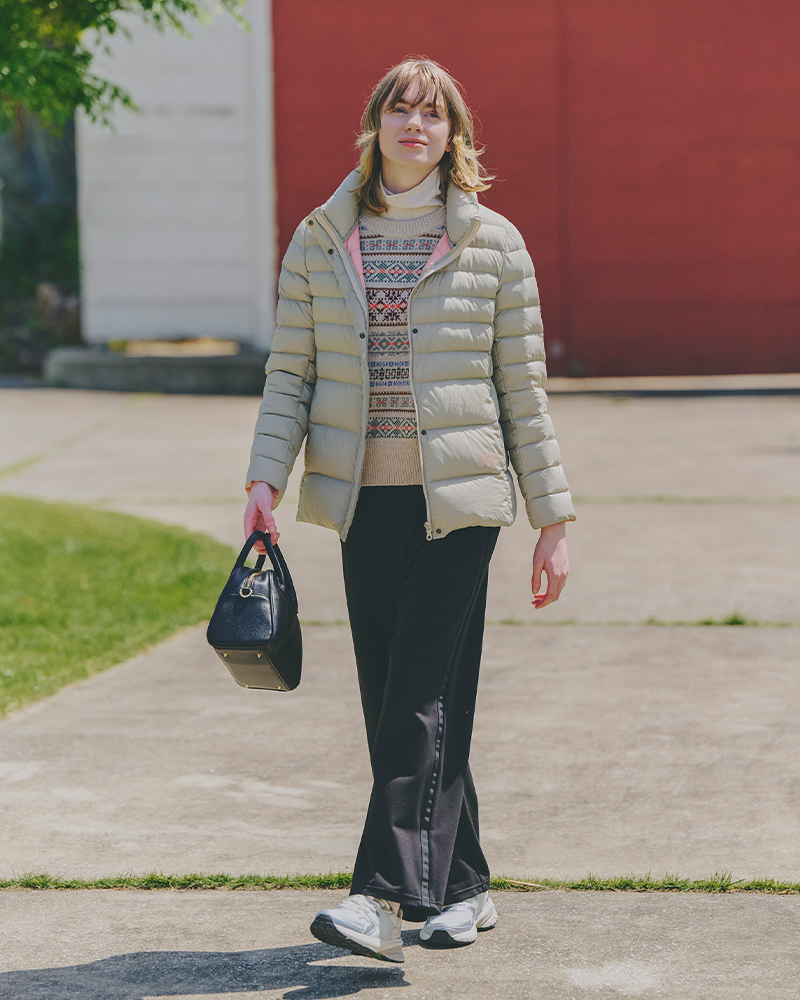 着ぶくれしがちのダウンアウターも、GBのダウンジャケットなら薄手で体に沿ったデザインだから、モコモコせず、すっきりしたシルエットに。トップスは冬のコーディネートを明るくしてくれるベージュでまとめつつ、表情豊かなフェアアイル柄ニットを合わせるのがポイント。ボトムを黒で引き締めれば、メリハリが生まれ、スタイルアップも叶えてくれます。