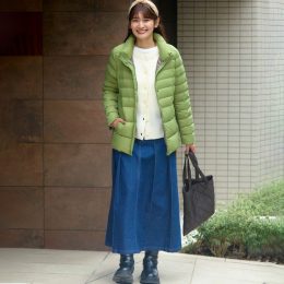 Women / 168cm 【着用サイズ】 トップス:Mサイズ ・ スカート:64サイズ ライトグリーンのダウンが冬の装いに明るさをプラス。アイボリーのカーディ...
