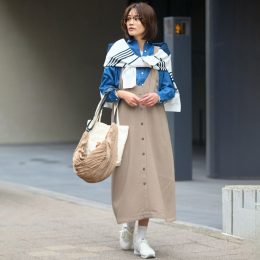 Women / 167cm 【着用サイズ】 トップス:Mサイズ ・ スカート:Mサイズ きれいめカジュアルに仕上がるデニムシャツに、カーキのジャンパースカートを...