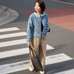 Women / 162cm 【着用サイズ】 トップス:Mサイズ ・ パンツ:Mサイズ コンパクトなデニムジャケットに、繊細なレース襟を合わせて程よく甘さをプラス...