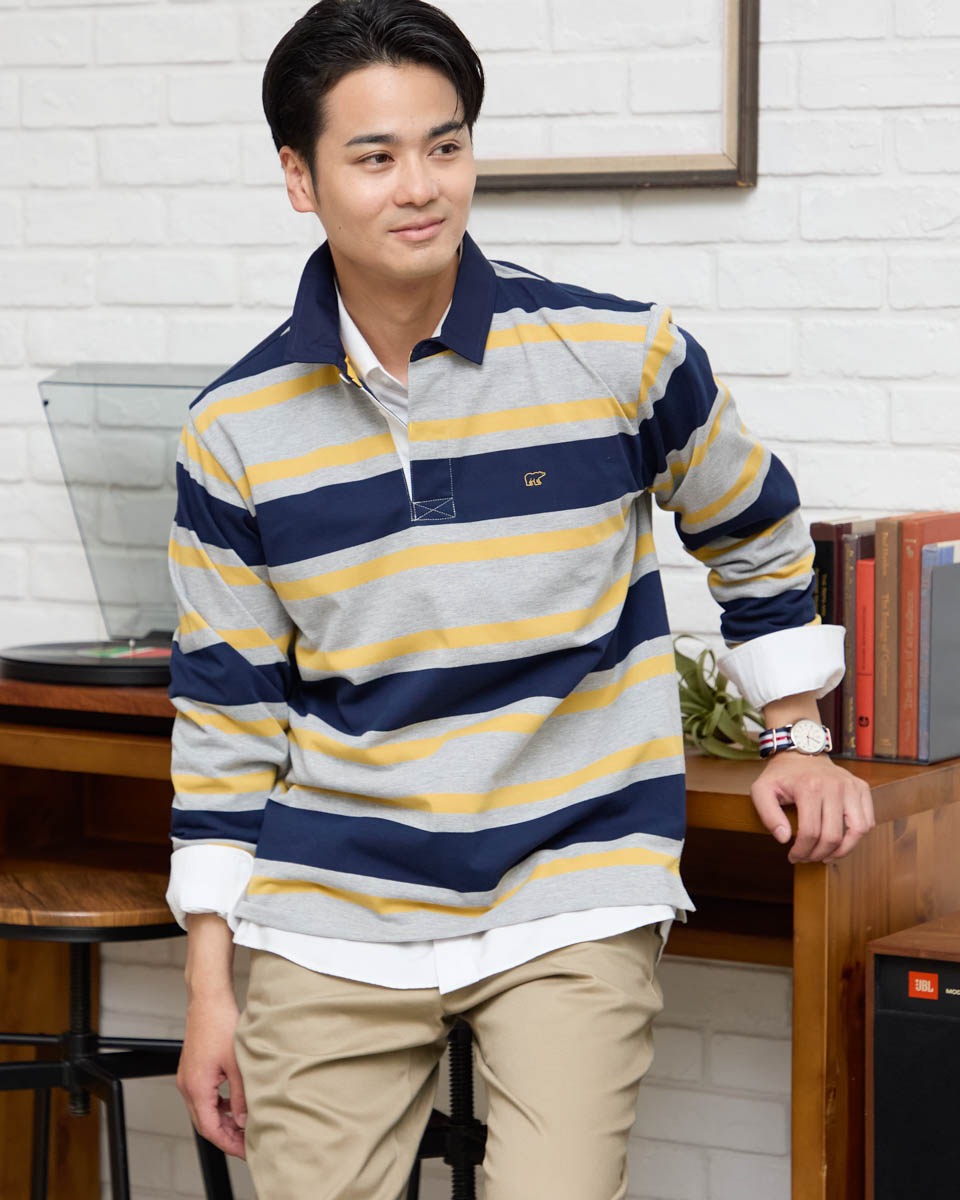 トラッドスタイルの王道、紺ブレザーをベースに、ラガーシャツとチノパンで軽やかに着崩したプレッピースタイル。インナーにはボタンダウンのオックスフォードシャツを仕込み、襟元のボタンを外して立てることで、こなれた抜け感を演出。首元からはボーダーのニットタイを覗かせ、肩掛けしたマスタードイエローのスウェットシャツとバーガンディーのキャップを差し色にすることで、クラシックな装いに遊び心と華やかさをプラス。足元のデッキシューズで程よくカジュアルダウンし、伝統と軽快さが絶妙に調和した都会的トラッドスタイルに仕上げました。