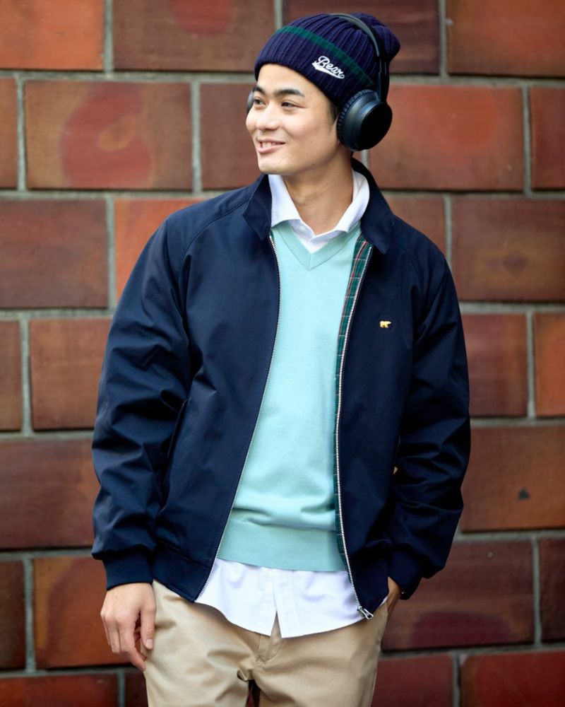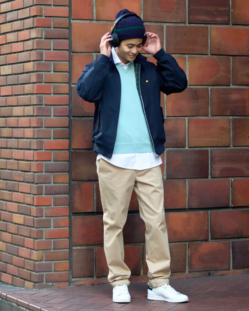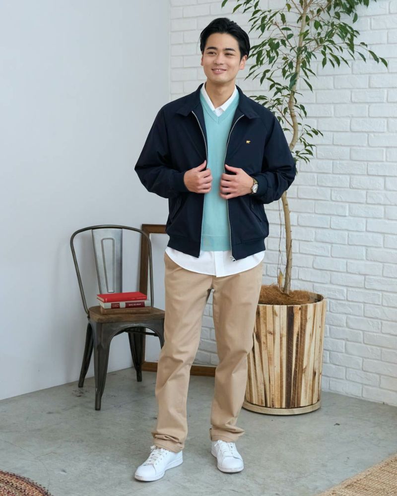 季節の境目、何を着るか迷う朝に自然と手が伸びるスイングトップを軸にしたレイヤードスタイル。軽やかな着心地と、裏地のチェックがさりげなく気分を上げてくれます。シャツの上に重ねたVネックニットベストが、コーディネートに柔らかな奥行きをあたえ、肩肘張らない大人の余裕を演出。すっきりしたラインのテーパードチノで全体を引き締め、ラフになりすぎないバランスに仕上げました。気取らず、でもきちんと見える。そんな日常にちょうどいいスタイルです。