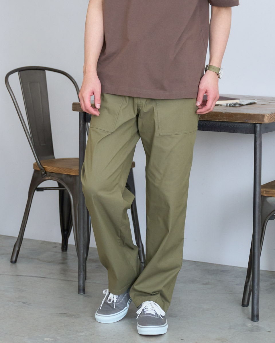 カーキのベイカーパンツで雰囲気をカジュアルダウンし、足元は重くなりすぎないカラーのスニーカーを履くとコーディネートが軽くまとまります。